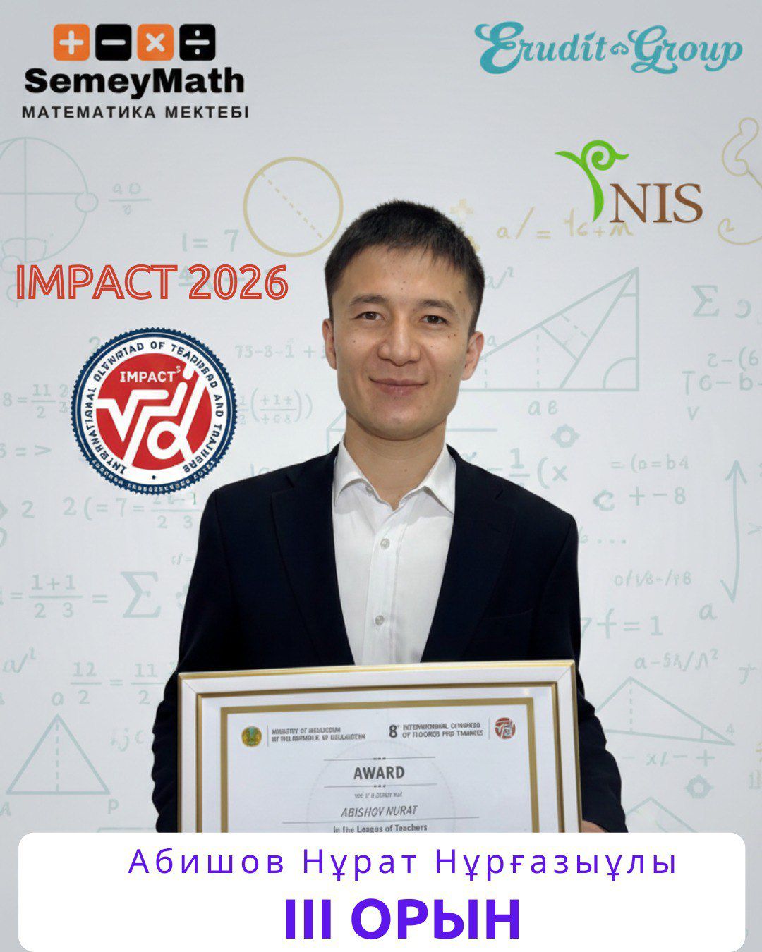 Жуырда өткен беделді IMPACT халықаралық математика мұғалімдерінің олимпиадасында Нұрат Нұрғазыұлы өзінің кәсіби шеберлігі мен терең білімін дәлелдеп, жүлделі III орынды иеленді.