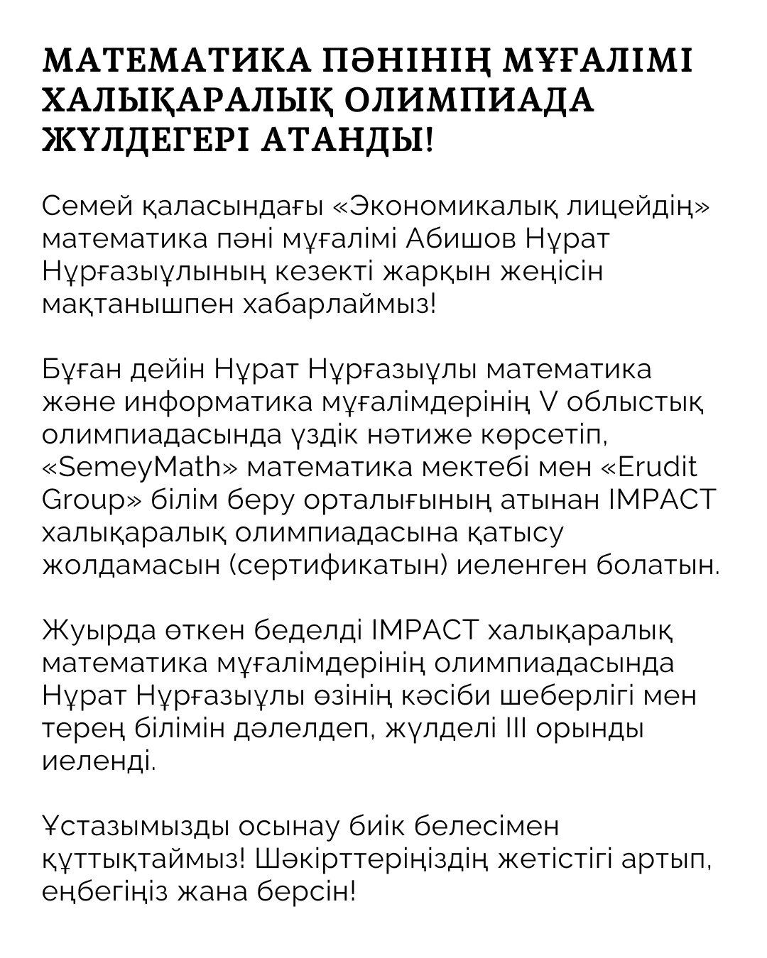 Семей қаласындағы «Экономикалық лицейдің» математика пәні мұғалімі Абишов Нұрат Нұрғазыұлының кезекті жарқын жеңісін мақтанышпен хабарлаймыз!